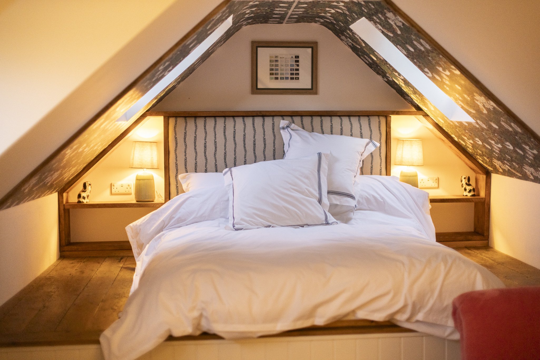 Tucked into the eaves of the Hayloft, the king-size bed sits beneath a ceiling adorned with William Morris wallpaper, creating a cosy, romantic retreat. The bed is dressed in 100% organic cotton sheets and a duvet cover for a soft, breathable sleep. A plush pink velvet sofa invites you to unwind, while a dormer window offers a charming view over your private courtyard garden.