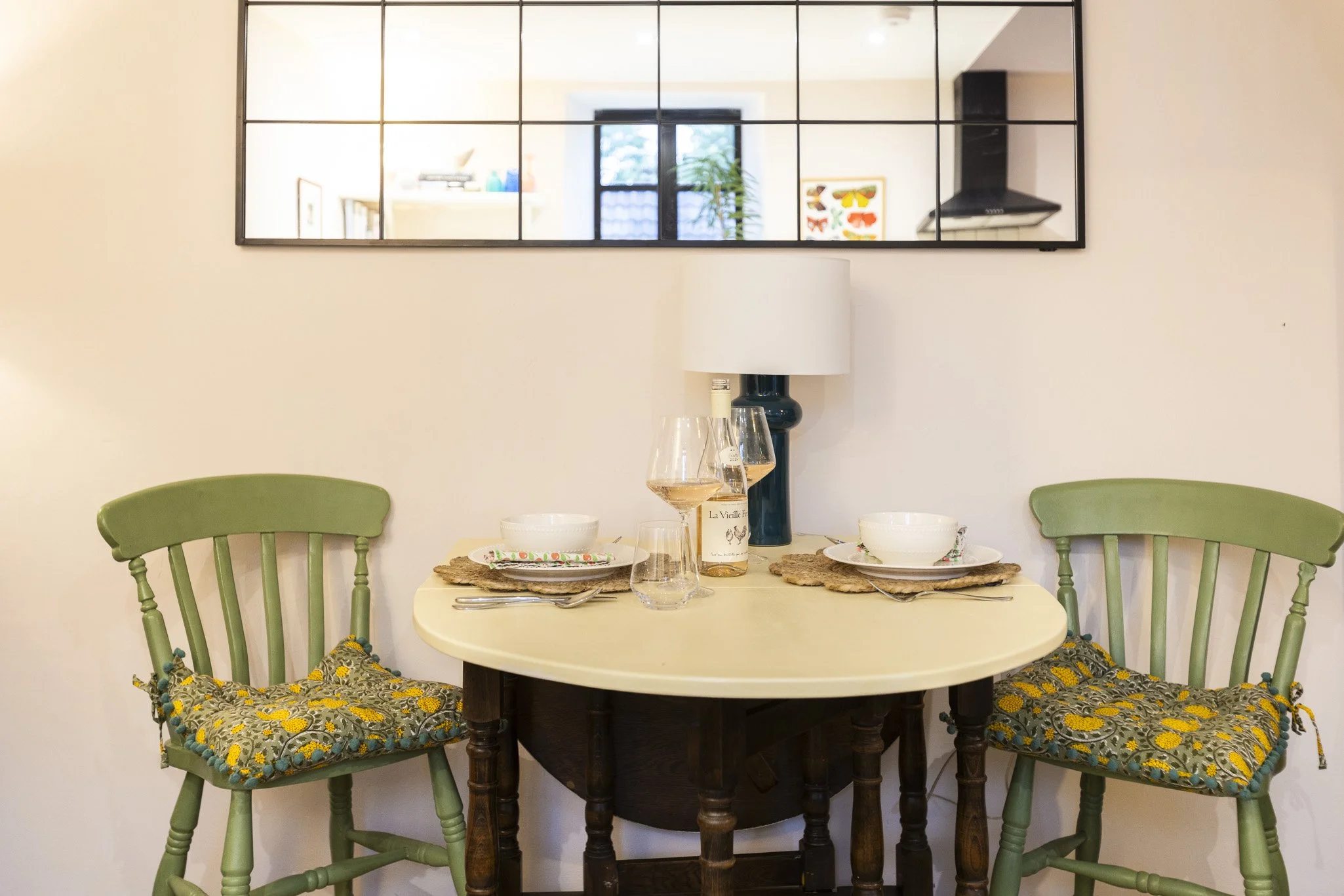 In the open-plan living space, the dining area features a drop-leaf table that can be extended to create a larger surface, perfect for meals or relaxing with a book. Two comfortable chairs and a mirror that reflects the light add to the bright, airy feel, ideal for enjoying breakfast, lunch, or supper at your leisure.